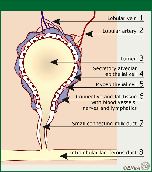 Los lóbulos irregulares o glándulas individuales se subdividen en varios lóbulos, cada uno provisto de un conducto de leche separado. La parte principal del sistema de conductos lácteos consiste en los conductos ramificados, los conductos más pequeños se denominan conductos interlobulares, los más pequeños son túbulos alargados, llamados conductos alveolares. Estos finos conductos terminales están conectados con evaginaciones en forma de uva, llamadas alvéolos. Durante la lactancia, la secreción de leche tiene lugar en los conductos terminales y los alvéolos. El revestimiento interno de los conductos y los alvéolos está compuesto por células secretoras epiteliales cuboidales, encerradas por una red entrelazada de células mioepiteliales y láminas basales.